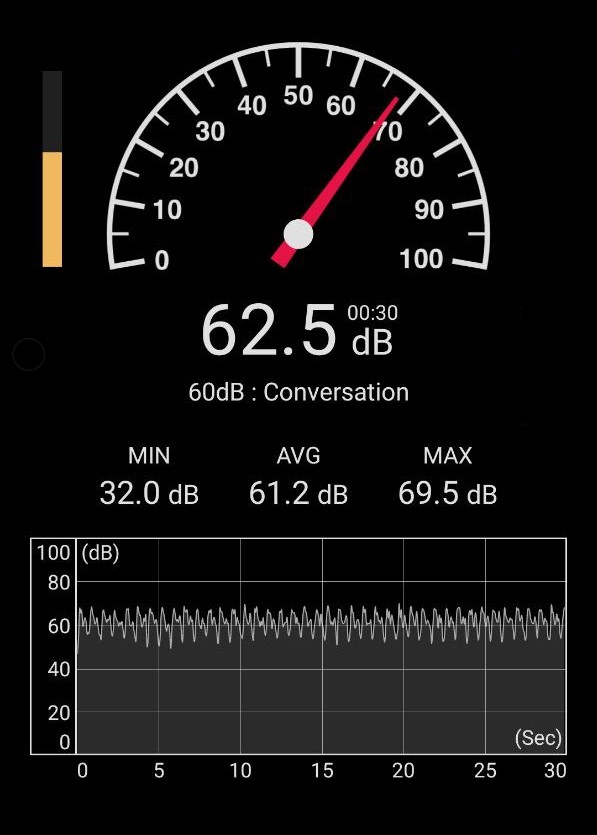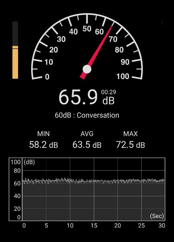 Vulse reaches around 66 dB at its highest level (but this can vary greatly depending on if you’re using it internally, etc). For anyone not sure what this sounds like: