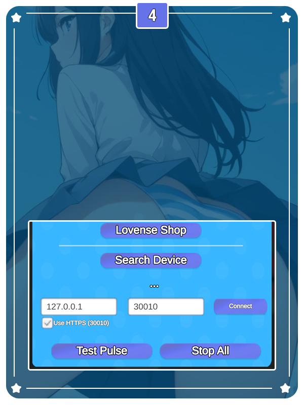 In the game's “Settings” menu, go to “Lovense” page and enable “Lovense Integration”. Choose “Windows” then hit “CONNECT”.