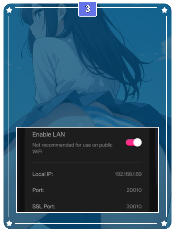 Enable"Lan"at the top. Check the "LocalIP" and "Port" shown on the screen.