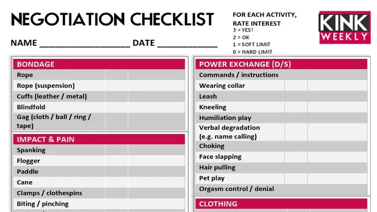 This is the part most people expect — spanking, bondage, sensation play, impact toys, and all the tactile things you might try. A checklist helps you sort these into categories: hard yes, maybe, or absolutely not.