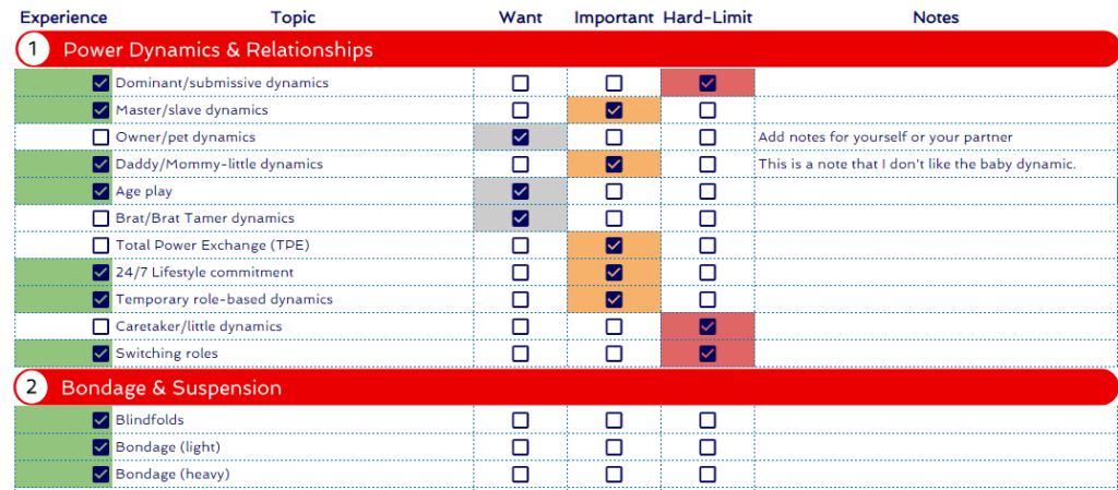 Instead of lumping them together, a detailed checklist lets you mark what excites you, what you’re curious about, and what you never want attempted. Breaking things down this way avoids vague answers like “I’m into bondage” — which can mean very different things depending on the person.