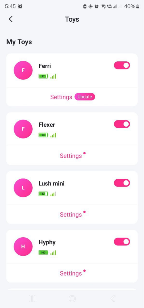 - Select your toy to connect by toggling it on — the app will confirm when pairing is successful.