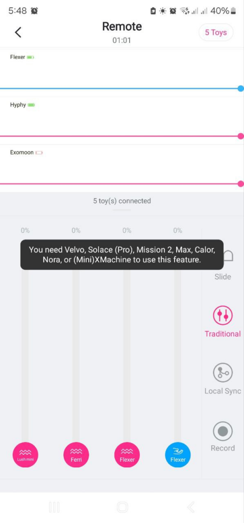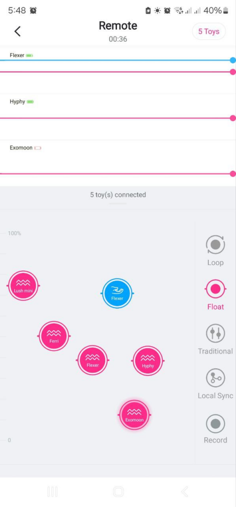 “Slide” and “Traditional“. Both include Local Sync (for select toys with haptic feedback) and Record (to capture and save custom patterns). In Slide mode, you’ll also see Loop and Float—Loop repeats the motion you make on screen, while Float holds the intensity where you release. Traditional mode works like a vertical slider, limited to four toys at once.