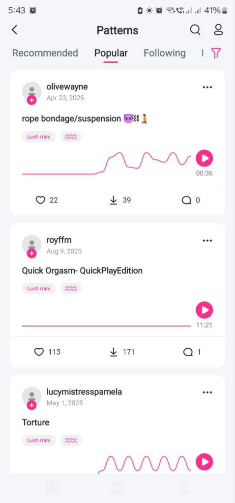 - Patterns Library – Browse Recommended or Popular patterns, filter by toy type or upload date, and even set duration brackets. You can also follow creators who share patterns you like.