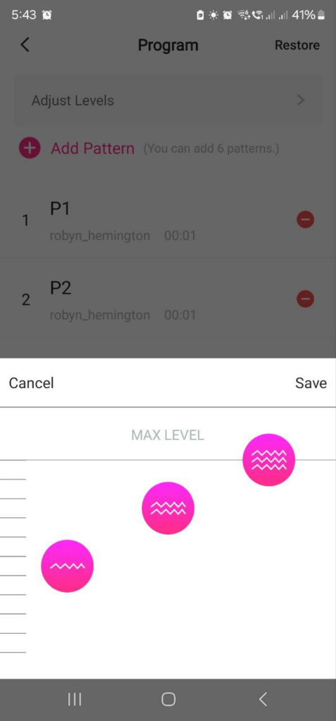 - Programmable Slots → Inside the app, you can design up to 10 custom vibration patterns. Once saved, these patterns can be accessed alongside the steady levels/presets.