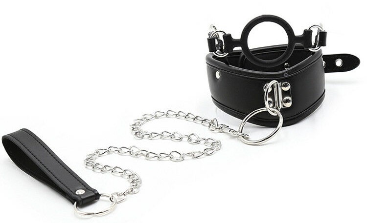 Yay! Another combo! A collar, plus leash, plug gag. The straps seem to be forgiving enough for different body shapes. And even though it’s fake leather, the silicone saves it. Especially great if the sub loves taller collars.