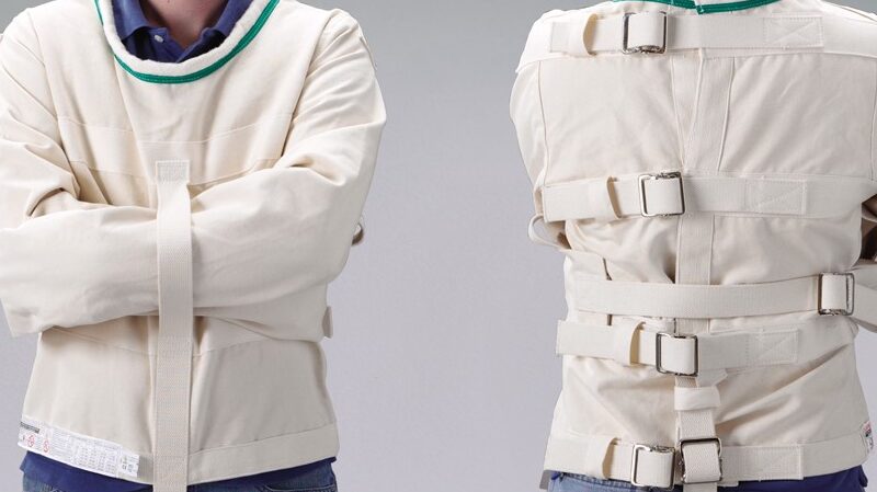 Traditional jackets have a low collar (avoiding the neck for safety), arms crossed at the front (through a strap), one crotch strap, and four straps along the back to adjust the fit.