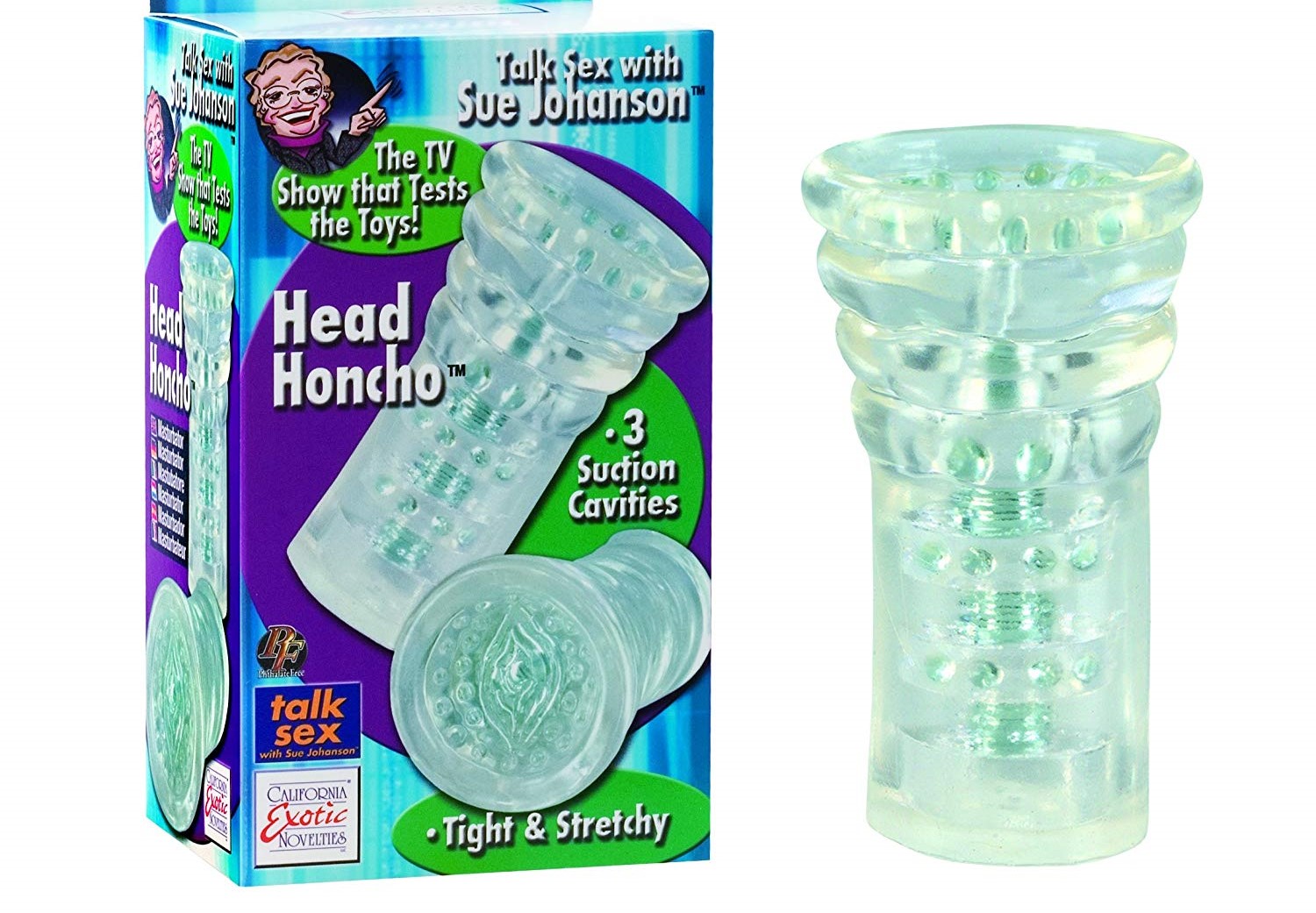 Do any of you remember Sue Johanson? She was that awesome old lady that taught Sex Ed. Well, I guess she reviewed this toy because her name and face are plastered all over it. It’s a straight forward, rubber masturbation sleeve.