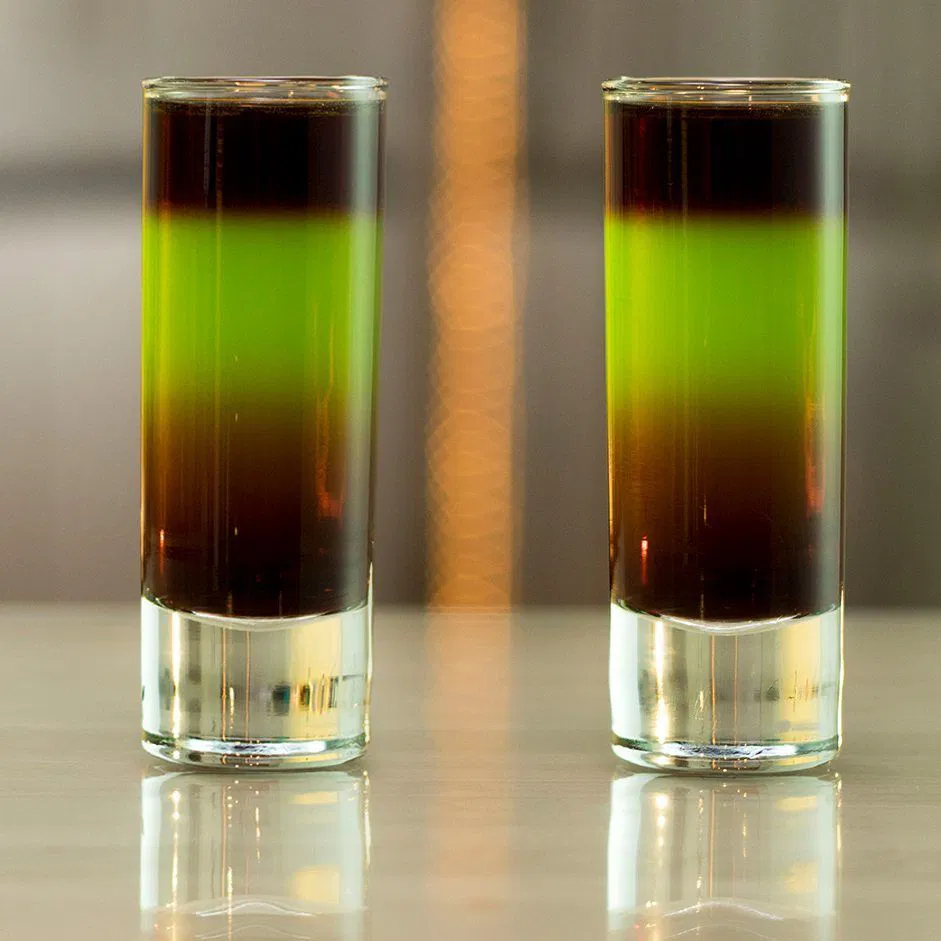 Pour in equal parts into a shot glass, stir, and serve