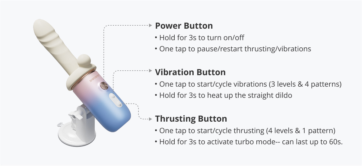 Turbo Mode lets you enjoy up to 1450 thrusts per minute. Make sure you are using the straight dildo, then hold the thrust button for 3 seconds. You can also open the Lovense Remote app and hold the thrust ball at the top of the control panel for 3 seconds to unlock, then simply slide the ball into the "Turbo Mode" section to turn on.